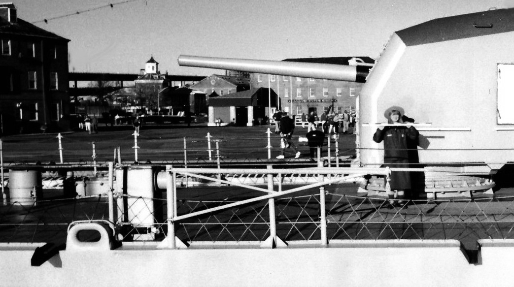 schwarzweiße Foto zeigt einen "Kranarm" kurz hinter dem achteren 127-mm-Turm.
