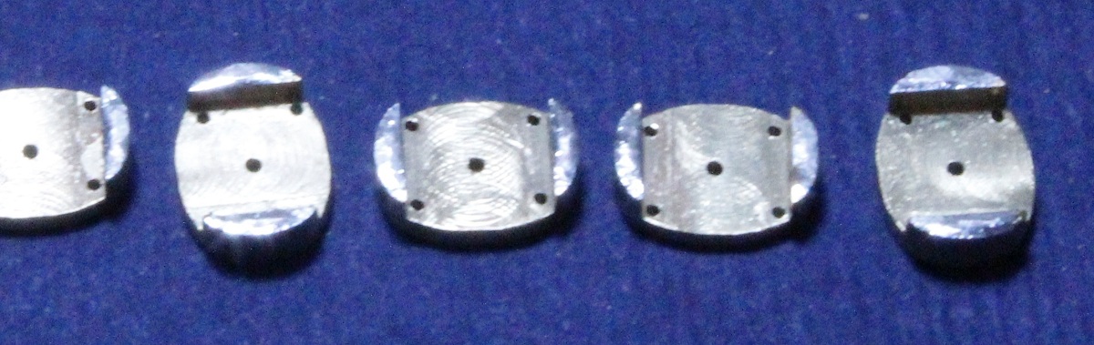 liegen drei der gefrästen Seitenteile mit 2-mm-Bohrungen (0,4 mm dick abgesägt).
