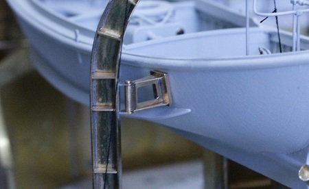 steht das Boot in einer U-förmigen Rinne am Deckshaus, hinten hängt es nur in