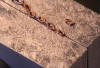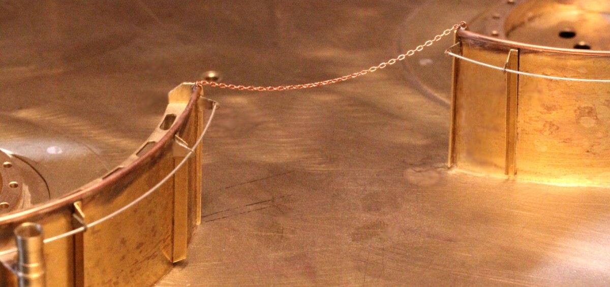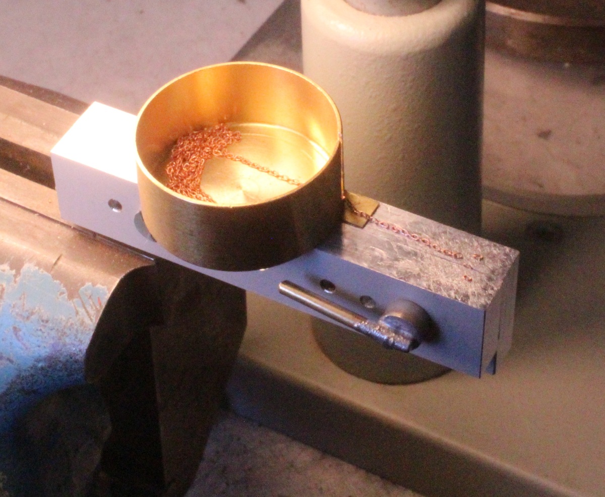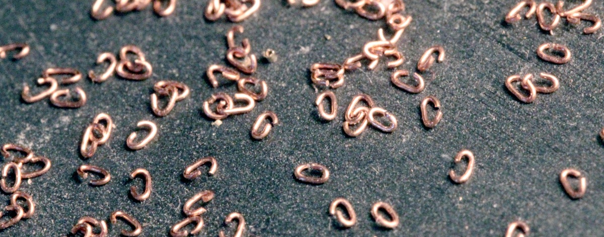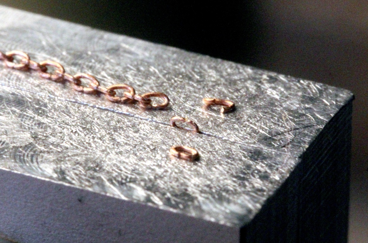 Bildmitte ist ein Glied im Spalt geklemmt, links liegt die schon fertige Kette,