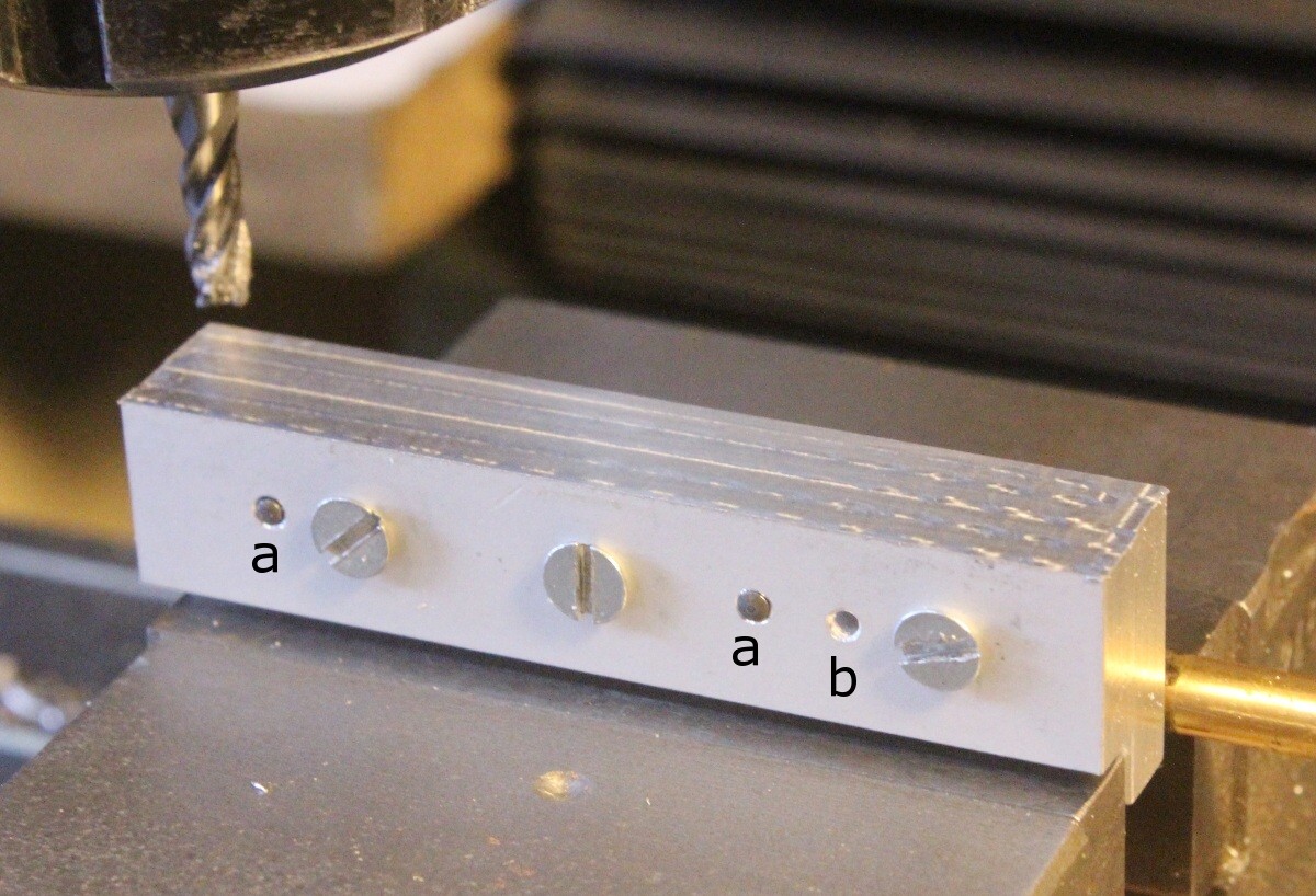 und mit zwei Zylinderstiften (a) verstiftet. (b) ist eine Vorbohrung für eine