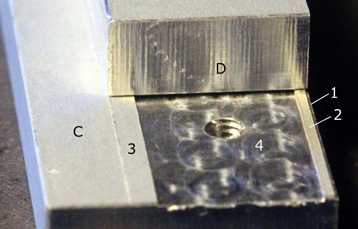 Freistich, (3) die untere Anlagefläche für die bewegliche Backe (D), (1) ist die