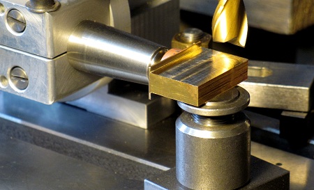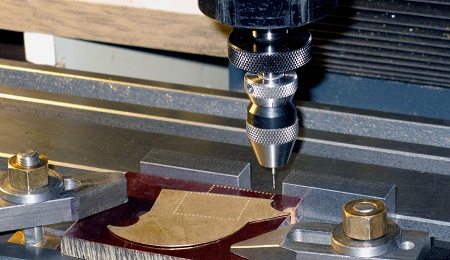 die Pertinax-Unterlage und bleibt festgespannt bis beide Bleche gebohrt sind.