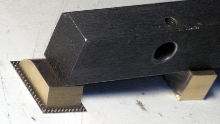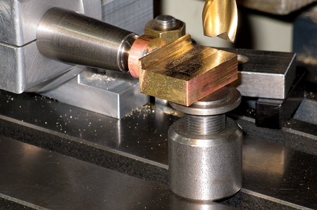 (Bei dieser Bohrarbeit habe ich erstmals meine "Neuanschaffung" zum Einsatz gebracht. Im Foto sieht man im Zangenfutter eine Feinbohrhilfe und daran ein Präzisions-Bohrfutter, welches den Namen verdient. Beide Teile kann man bei PFEIFFER-Werkzeuge bestellen, entweder in Mannheim Tel.-Nr. 0621-720060 oder in Karlsruhe Tel.-Nr. 0721-62630. Das Bohrfutter mit der Best.-Nr. 341180.0100 hat einen Spannbereich von 0,05 bis 1,5 mm und dabei einen hochgenauen Rundlauf. Mit der Best.-Nr. 341180.0200 gibt es ein ähnliches Bohrfutter mit einem Spannbereich von 1,5 bis 3 mm. Die Feinbohrhilfe mit dem Anschlußkonus B6 (passend zu den genannten Bohrfuttern) hat die Best.-Nr. 341200.0100. Es hat einen 66 mm langen 13-mm-Zylinderschaft für das Spannen in einer 13-mm-Spannzange. Eine ähnliche Feinbohrhilfe (Best.-Nr. 341200.0200) hat einen MK1-Schaft. Mit der Feinbohrhilfe, die man tatsächlich nur für dünnste Bohrer benutzt, hat man die Möglichkeit, diese sehr oft mit nur zwei Fingern aus der Bohrung zu ziehen und damit die Späne zu entfernen - kaum noch Bohrerbruch. Übrigens: In meinem Buch "Fräsen für Modellbauer" Band 1 habe ich auf den Seiten 56 bis 61 den Selbstbau von zwei verschiedenen Feinbohrhilfen für eine Fräsmaschine angeregt. Und unter Best.-Nr. mz008 kann man bei mir Bauanleitungen für zwei Formen von Feinbohrhilfen für eine Drehmaschine bestellen.)