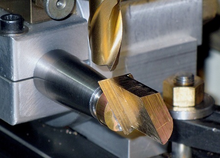 Spitzdrehstahl (etwa 20° spitz) wird zuerst der "Kopf" plangedreht. Dann wird