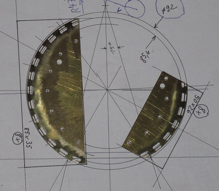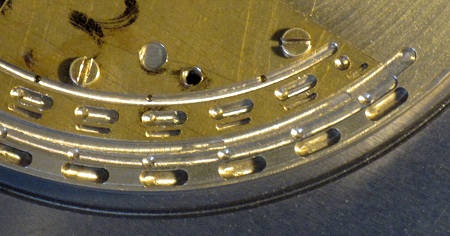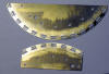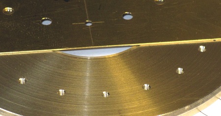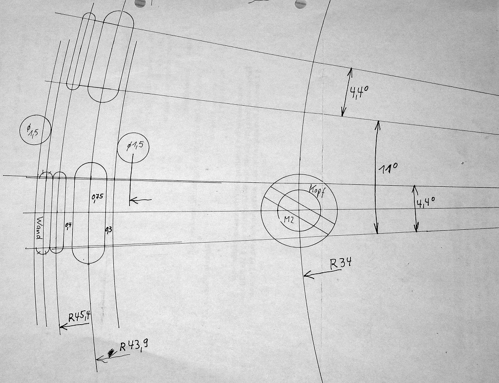 in 11°-Abständen 4,5° lange Langlöcher mit Durchmessern (Breiten) 0,6 und 1,5 mm