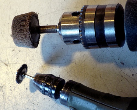 Grat. Dann wurde noch mit einer rotierenden Drahtbürste (unten, ebenfalls stark