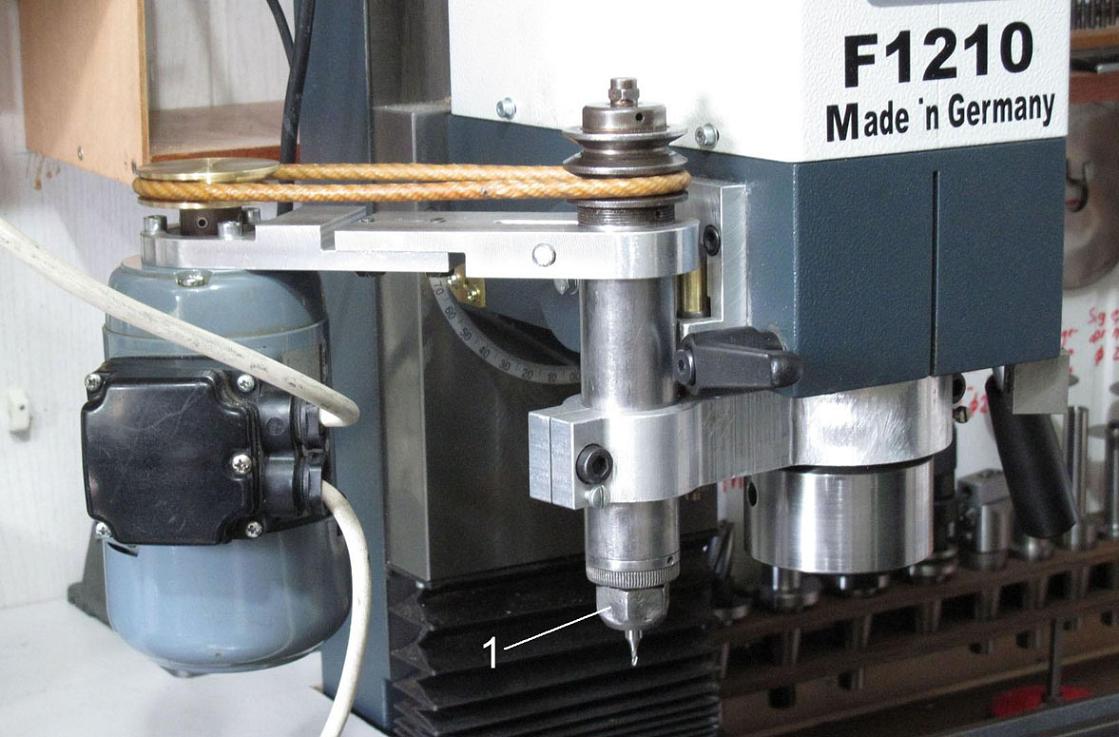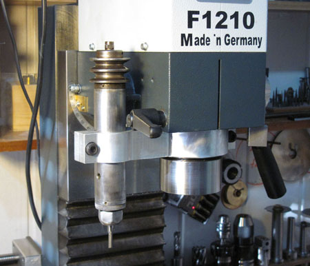 Häufig habe ich auf meiner Fräsmaschine WABECO F1210 mit ihrem 1,4-kW-Antriebsmotor Arbeiten mit kleinsten Bohrern und Fräsern auszuführen. Neulich habe ich eine "Auslegerbohrmaschine", zu spannen im Zangenfutter (Verwendung der 20-mm-Spannzange), gebaut, siehe hier. Die Sache ist gut und genau. Ich habe aber Zweifel wegen der Dauerhaftigkeit des PROXXON-Bohrmaschinen-Spielzeugs, neulich waren die Geräusche schon beängstigend. Ein guter Freund versorgt mich ständig mit dies und das vom Schrotthändler. So hat er mir auch schon zwei fast neue Frässpindeln von einer Gravier-Fräsmaschine besorgt. Er hat Zeit, regelmäßig zum Schrotthändler zu gehen. Eine dieser Spindeln will ich als Grundlage für einen Schnell-Fräskopf für meine F1210 verwenden. Große Werkzeug-Fräsmaschinen haben immer als Zubehör auch einen Schnell-Fräskopf. Außerdem bekommt mein Fräskopf bei der Gelegenheit einen relativ kleinen Elektromotor, sodaß in Zukunft auch eine Stromersparnis entsteht.