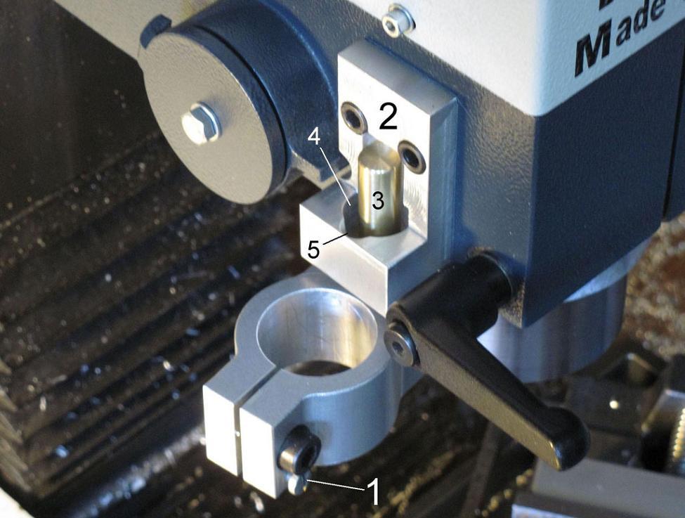 einer M8-Inbus-Schraube (5) an den Hals der Frässpindel geklemmt.