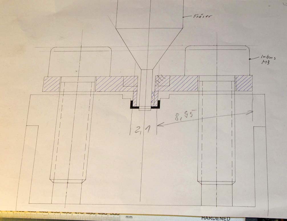 Querschnittszeichnung vom kombinierten Präge- und Fräswerkzeug, das ich mir für