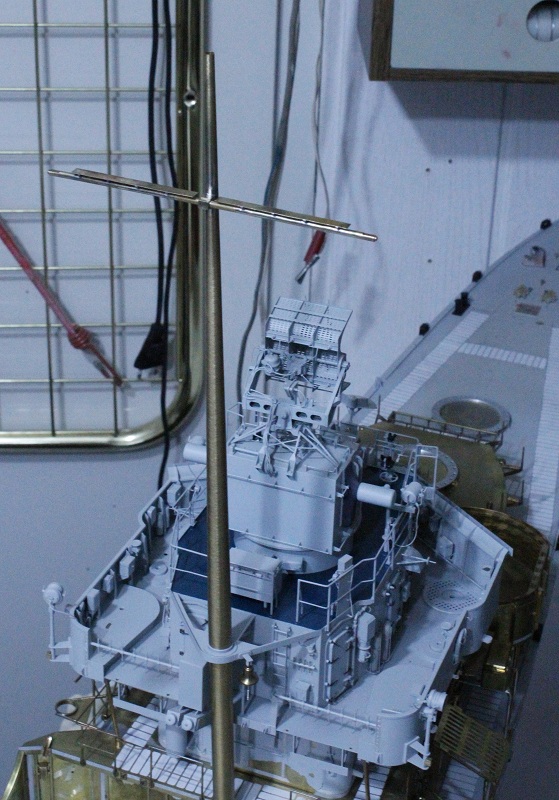 Der Pfahlmast als gedrehtes und aus mehreren Einzelstücken zusammengelötetes Rohr war schon längere Zeit fertig. Dieses Rohr hat am unteren Ende als Halbschale einen Verdrehungsschutz. Deshalb kann es bei der Anbringung von Details an diesem Mast und bei der Montage am Modell nie verdreht werden. Teile, die exakt in Querschiffsrichtung an den Mast angebaut werden müssen (z.B. Rahen), werden so auch von mir angebaut. Ebenso Teile, die in Schiffslängsrichtung (z.B. Radarkonsolen) genau stehen müssen. Anschließend will ich zeigen, wie das im Einzelnen geschieht. Ich beginne mit einem relativ großen Teil. Recht weit oben sitzt an der Hinterkante des Mastrohrs eine "Rah" mit div. Teilen daran. Diese Rah wird von einer Halterung in Richtung gehalten. Man könnte diese in Anlehnung an ein vergleichbares Teil in der Segelschiffstakelage auch gut Rack nennen.