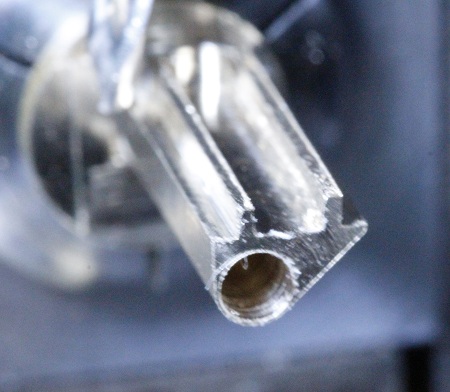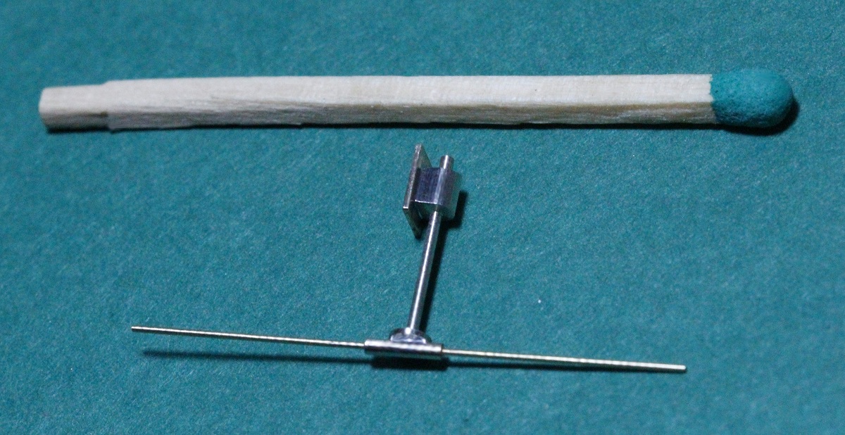 0,4-mm-Querbohrung, er ist 36 mm lang, die Enden 0,4 mm Durchmesser. Dazu der