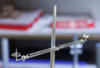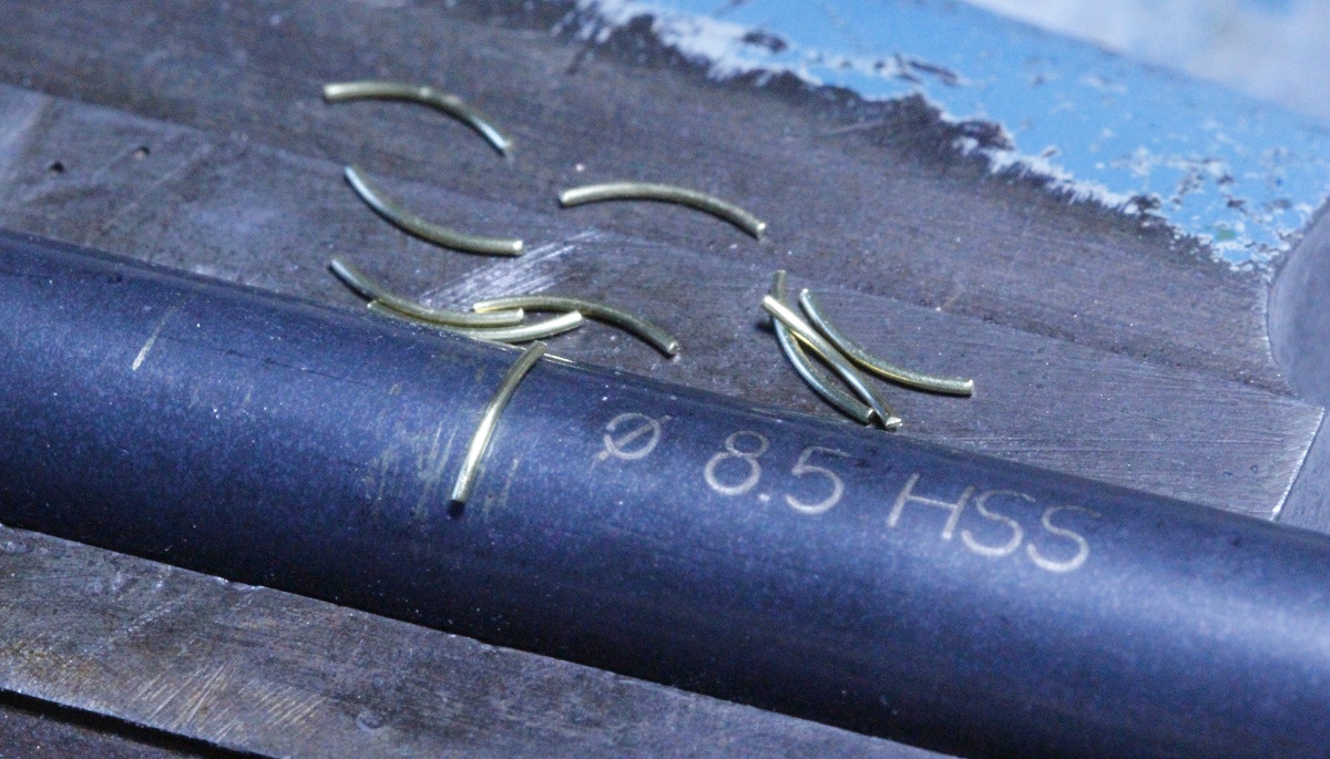 Die drei Stufen der Herstellung der Speichen, von links: Abschneiden auf 5,6 mm