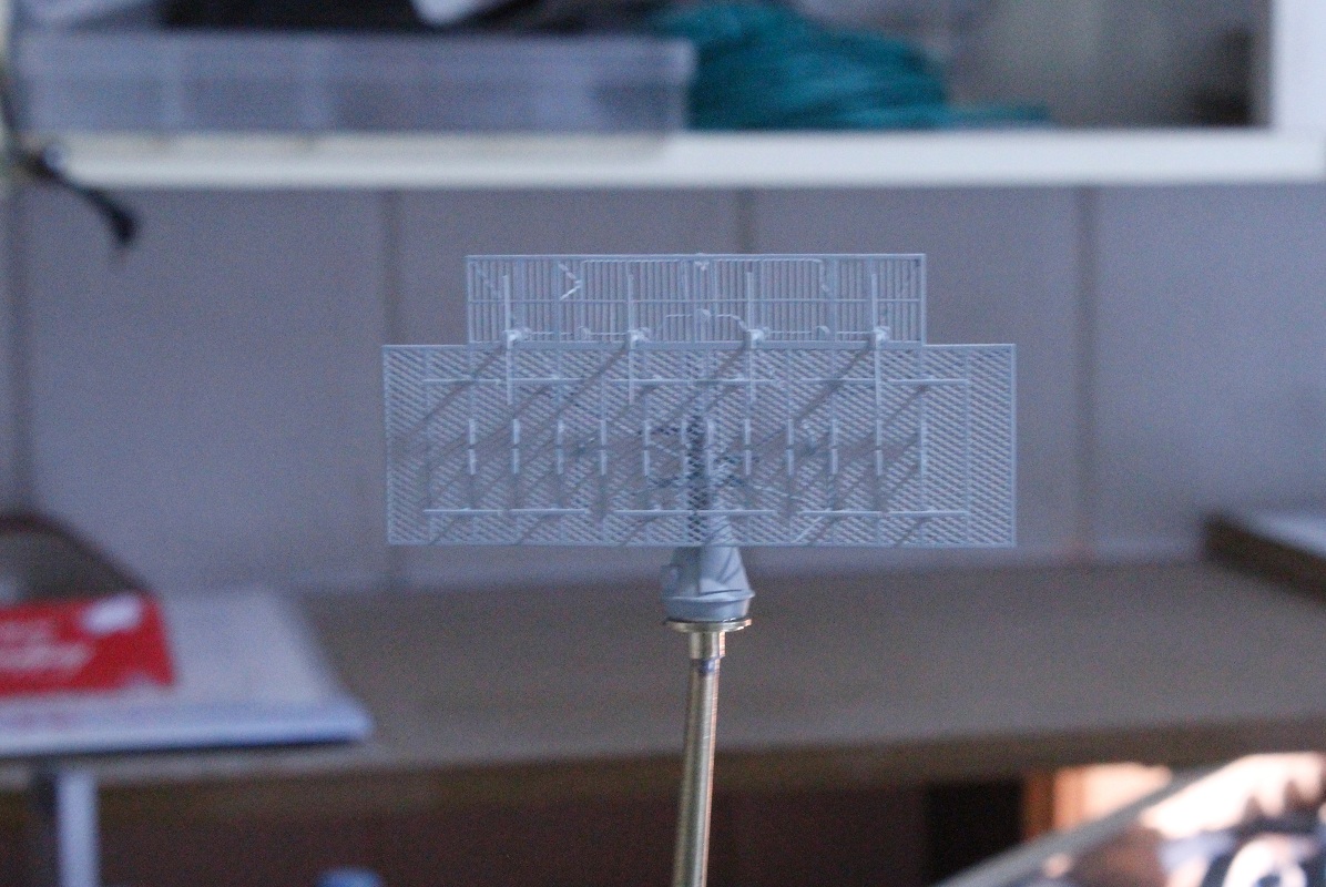 Der Mast ist in das Modell gesteckt und oben die Antenne aufgesteckt.