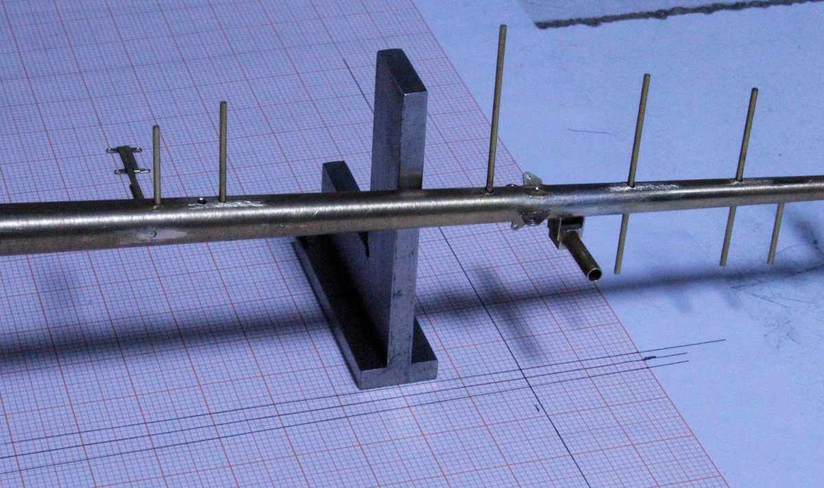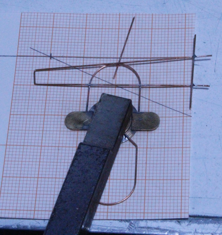 gebohrt und zwei Schrägstützen, ebenfalls 0,5-mm-Cu-Draht, exakt auf Länge