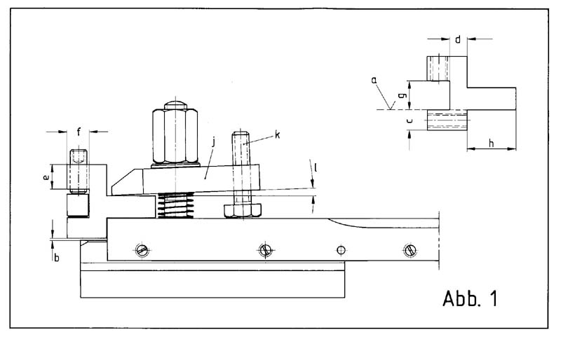 Zuerst habe ich die Querschnittsmaße für die prismatischen Stahlhalter-Körper festgelegt. Dabei gehe ich von den Gegebenheiten der Maschine aus. Abb. 1 zeigt die Verhältnisse auf dem Obersupport. Die waagerechten Auflageflächen für die Drehstähle an den Wechselhaltern sind als Verlängerung der Auflagefläche vom Obersupport zu betrachten (a). Dementsprechend habe ich die Höhenmaße möglichst auf 1/100-mm eingehalten. Wenn der Obersupport einmal weit zurückgezogen wird, sollte zwischen der Stahlhalter-Unterkante und der Grundkörper-Oberkante noch ein Spalt von etwa 0,2 mm vorhanden sein. Mehr aber nicht, denn die Höhe (c) würde unnötig reduziert. Auch die Breite (d) sollte der Höhe (c) entsprechen. Die Höhe (e) sollte so hoch sein, daß sie mindestens einer überhohen Mutter für das Gewinde (hier M4) entspricht. Das Maß (f) macht man nur so groß, daß es der Breite der hauptsächlich verwendeten HSS-Drehlinge entspricht, also ebenfalls nicht mehr. Ich verwende Drehlinge mit einem Querschnitt von 5 x 5 mm. Also habe ich das Maß (f) 5 mm tief eingefräst. Die Höhe (g) ist bei meinen Wechselhaltern übrigens 6,5 mm, sodaß ich die Nut mit einem 5-mm-Fingerfräser vor- und durch seitliches Versetzen fertigfräsen konnte. Die sog. Einspannfahne macht man auch nicht zu kurz (Maß h).