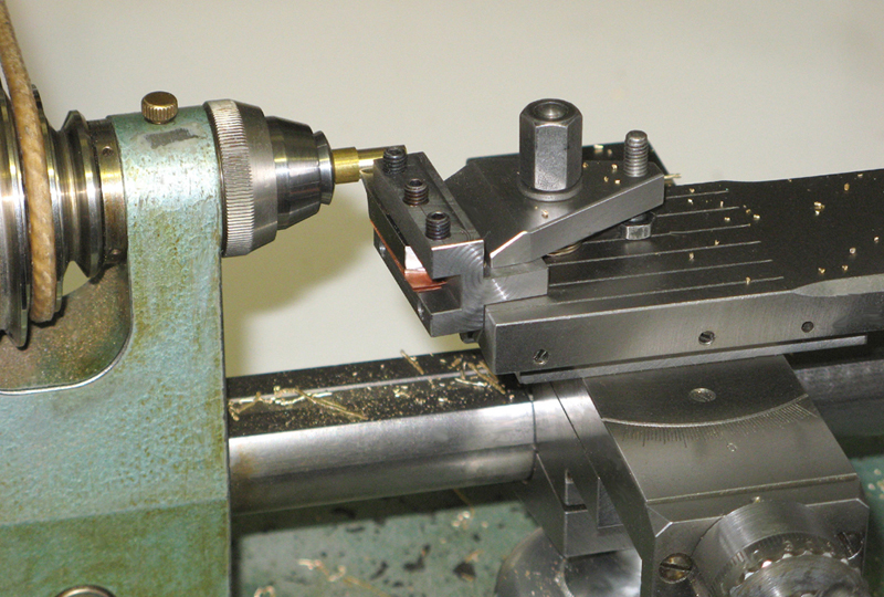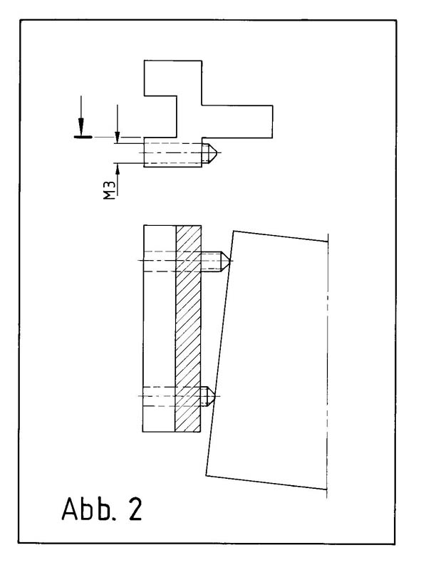 Bei zwei Wechselhaltern habe ich das Maß (f) 7 mm groß gemacht, damit ich auch einmal breitere Drehlinge (z.B. angeschliffene Formstechstähle) verkippsicher spannen kann. Alle 10 Wechselhalter sind 32 mm lang. Im oberen Stück wurden mittig drei Gewindebohrungen M4 für die Stahl-Klemmschrauben eingebohrt. Das sind Gewindestifte M4x10 mit flacher Stirn und Innensechskant. Alle 10 Halter haben im unteren Stück je zwei Gewindebohrungen M3. Dadurch kann man mit Gewindestiften M3x5 (mit Spitze und Innensechskant) sehr schön die Schräglage des Wechselhalters auf dem Obersupport einrichten (Abb. 2 und Foto 9, Beispiel Seitendrehstahl). Das ist besonders bei Stechdrehstählen wichtig, weil hier die Freiwinkel nach den Seiten für ein sicheres und sauberes Stechen sehr genau stimmen müssen. Doch auch für eine stets gleiche Schräglage bei Seitendrehstählen sind diese Einstellschrauben wichtig. Damit sich die M3-Gewindestifte nicht selbst verstellen können, habe ich sie in der Form „gekontert“, daß ich jeweils eine zweite in jede Bohrung hineingeschraubt habe. Die Spitzen der M3-Stiftschrauben waren mir zu spitz. Ich habe sie leicht gebrochen.