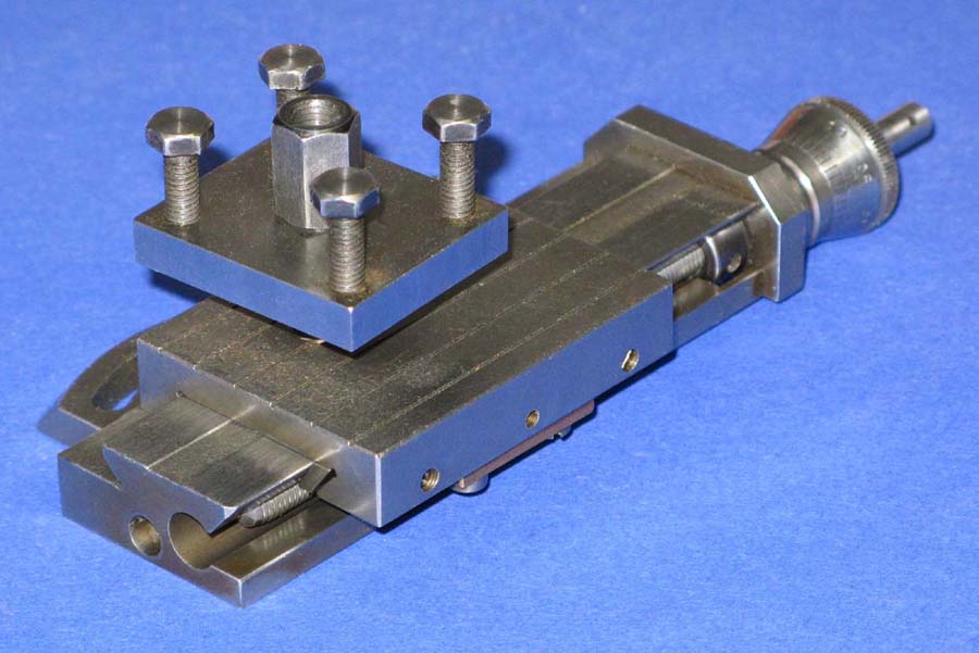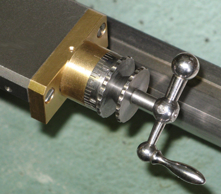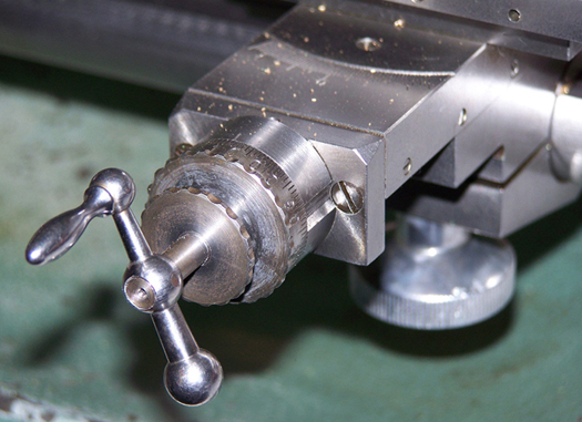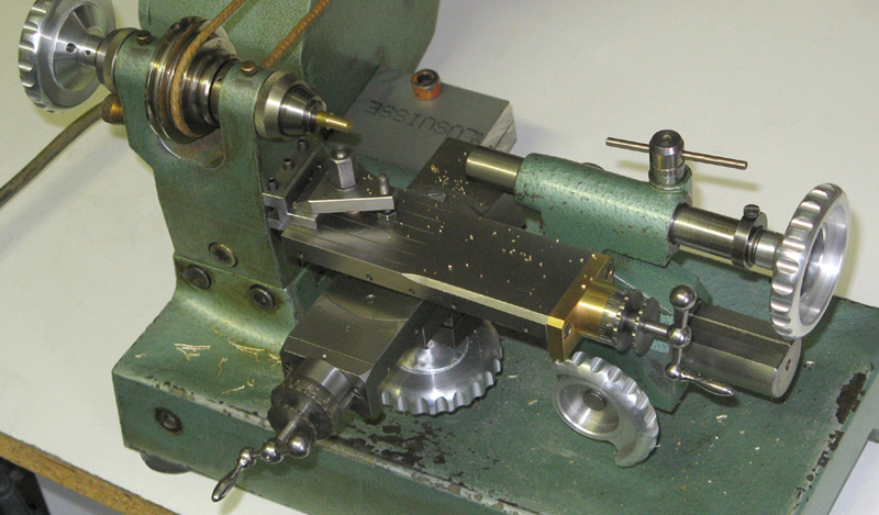Wie der neue Kurbel-Kreuzsupport nach dem Umbau aussieht, zeigt das Foto 4. Die Schiebeplatte muß keinesfalls aus Stahl sein. Ich habe sie aus „gemeinem“ Automatenmessing gemacht. Der Grundkörper ist ein Drehteil, das anschließend entsprechend vierkantig zurechtgefräst wird. Foto 8 zeigt das umgebaute Kurbelende vom Obersupport. Die flache Senkung oben in der Mitte ist die Einfüllöffnung für das Öl. Die ursprünglichen Kurbeln habe ich natürlich wieder verwendet. Die kleinere Scheibe mit den angefrästen Rändeln ist die Kontermutter für das Klemmen des Skalenrings. Auch beide Skalenringe habe ich bei dieser Gelegenheit deutlich vergrößert: den vom Obersupport auf 20 mm Durchmesser und den vom Quersupport auf 24 mm Durchmesser (ursprünglich beide nur Ø 14 / vgl. Foto 3). Das gibt eine bessere Zustellgenauigkeit. Beim Obersupport beträgt der Wert von Strich zu Strich, gut ablesbar, 1/100 mm (50er-Teilung). Und auch mit der Skala vom Quersupport kann ich nun in 1/100-mm-Schritten deutliche Durchmessermaße einstellen (Teilung 100)! Die Alu-Handräder der Anzugsrohre und weitere, oft benutzte Handschrauben habe ich mit aufgeklebten (2-K-Kleber), größeren Alu-Rädern griffgünstiger gemacht. Beim Foto 2 sind noch die kleinen Handräder zu sehen. Wie die Maschine mit den größeren Handrädern heute aussieht, zeigt das Foto 7. Dabei ist auf richtig guten Rundlauf eigentlich nur beim Handrad vom Anzugsrohr der Arbeitsspindel zu achten. Den großen Ring vom Handrad der Reitstock-Klemmung habe ich nachträglich zur Hälfte wieder weggefräst, weil dieses Handrad vorzeitig am Handrad der Support-Klemmung anstieß. Letzteres hat unten eine flache Planfläche. Damit steht der Kreuzsupport schön auf der Werkbank, wenn man ihn von der Maschine nimmt. Wie man all diese Arbeiten richtig ausführt, damit man am Ende auch Freude mit der Maschine hat, habe ich in meinen vier Bänden „Drehen für Modellbauer“ und „Fräsen für Modellbauer“ ausführlich beschrieben. Ich möchte es hier nicht wiederholen.