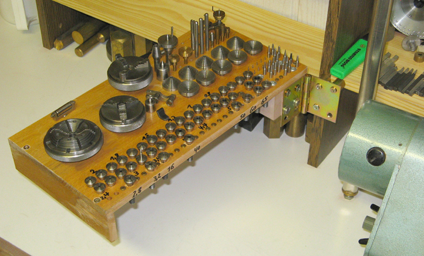Damit die Spannklaue (j) stets sicher mittig auf die Spannfahne des jeweiligen Halters drückt, sollte sie mit der Stützschraube (k) so eingestellt sein, daß sich eine leichte Schräglage (Winkel l in Abb. 1 etwas übertrieben dargestellt) ergibt. Für das Spannen eines Bohrdrehstahls (Foto 6, 3. von links) kann der Wechselhalter auch an der hinteren Längsseite des Obersupports angelegt werden. Für das Einrichten der Höhenlage der Drehstähle habe ich eine ganze Anzahl 0,1 mm dicke Streifen von Kupferfolie (24 x 5 mm) und sogar Streifen von Transparentpapier. Wenn die Drehstähle richtig (!) scharfgeschliffen und ganz exakt auf Höhe eingestellt sind, ist es kein Problem, selbst dünne Zapfen von z.B. 0,2 mm Durchmesser auf einem Uhrmacherdrehstuhl zu drehen (vgl. meine Bücher). Einen besonderen „Luxus“ habe ich mir noch geleistet, man gönnt sich ja sonst – alles! Ich habe das Steckbrett für alles Maschinenzubehör mit einem großen Scharnier schwenkbar am Regal befestigt (Foto 10). So kann ich das Brett herausschwenken, wenn ich z.B. die Spannzangen bequem in Reichweite haben will und wegschwenken, wenn ich „Null-Bock“ auf drehen habe.