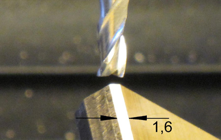 beide Ecken 1,6 mm breite Fasen über die gesamte "Höhe" der Platte angefräst.