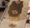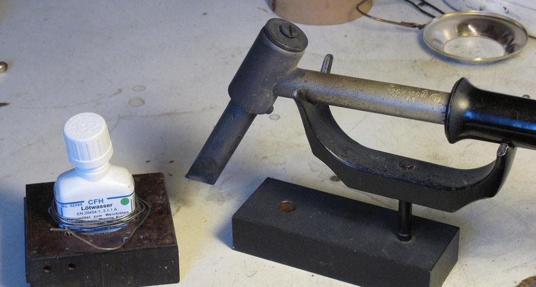 "drücken". Zufällig im Bild: Der Standfuß für die Flasche mit der Lötsäure. Er