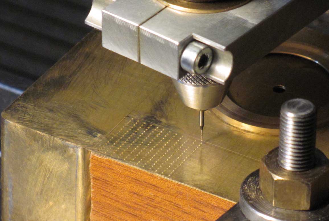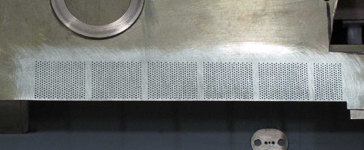 Bohrung zu Bohrung 1,00 mm Abstand. Zwölf Reihen sind gebohrt.