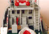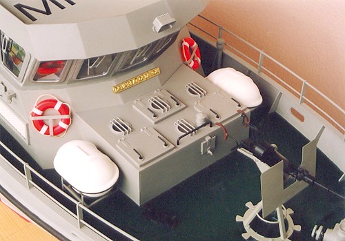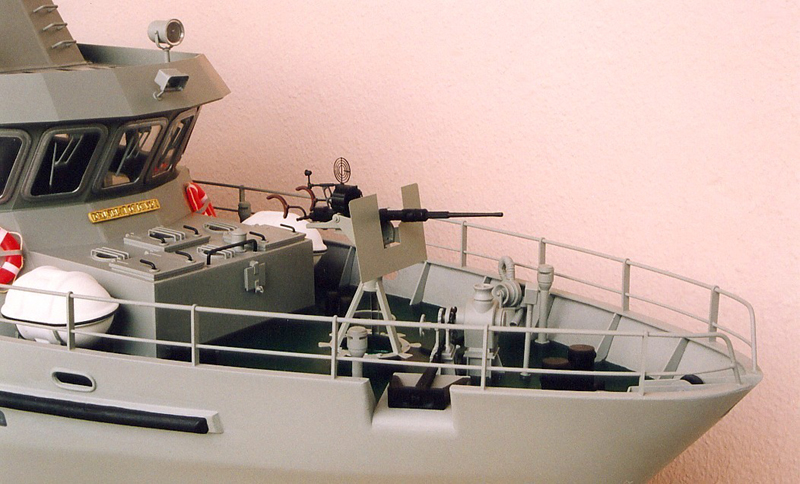 Für relativ viel Geld kaufte ich den Baukasten. Die Qualität der schweren Zinn-"Beschlag"-Teile war dermaßen fürchterlich, daß ich mich entschloß, alle Teile selbst und aus viel leichterem Plexiglas herzustellen. Am Ende blieb eigentlich nur die GFK-Rumpfschale übrig, obwohl auch diese schlimme Baufehler hatte. Oberstes Ziel war extreme Leichtbauweise für alle Teile. Deshalb konnte ich dem fertigen Modell viel "Energie" in Form von Akkus, tief unten im Modellrumpf, beigeben. Das "Seeverhalten" ist aus den genannten Gründen mehr als gut. Die Erkenntnis trifft für jedes (!) Schiffsmodell zu: Alles, besonders die sehr hoch liegenden Teile, werden extrem leicht gebaut, Drehteile kann man z.B. bis auf 0,3- 0,5 mm Wandstärke hohl drehen. Wenn man diese Regel bei einem Fahrmodell konsequent einhält, hat jedes (!) Modell "gute Fahreigenschaften" und legt sich bei Kurvenfahrt eben nicht auf die Seite - und kippt um. Mein Modell erhielt auf dem Vorschiff zusätzlich eine 20-mm-OERLIKON-Waffe: