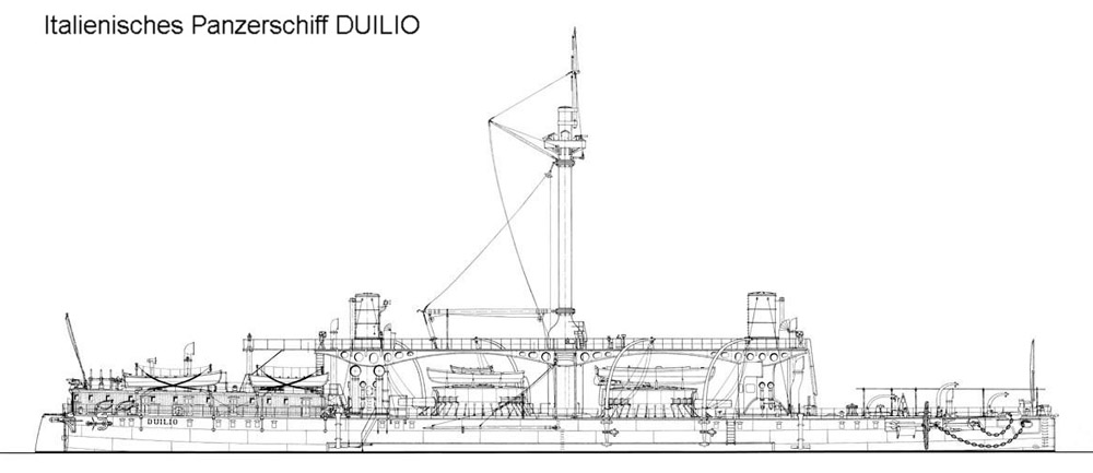 DUILIO ging am 8. Mai 1876 zu Wasser. Bis das Schiff im Jahre 1909 aus der Flottenliste gestrichen wurde, hat man es häufig umgebaut. Ursprünglich stand genau in der Mitte der für die italienischen Panzerschiffe jener Zeit charakteristische Gefechtsmast. An diesem war ein rundum schwenkbarer Bootskran zum Bedienen der schweren Boote auf den Turmdecken angebracht. Dieser eine Mast wurde später durch zwei weit auseinanderstehende Masten ersetzt. Weiterhin erhielt das Schiff auf dem Achterdeck riesige Barkunen zum Aussetzen von zwei Torpedobeibooten. Im Zuge der waffentechnischen Entwicklung ersetzte man z.B. bei DANDOLO in den neunziger Jahren die schwerfälligen Hauptkaliber gegen vier 254-mm-Hinterlader L/40. Obwohl andere Flotten längst zur ebenso wirkungsvollen Mittschiffsaufstellung der schweren Waffen übergegangen waren, hielt man in Italien noch längere Zeit an der Diagonalaufstellung fest, z.B. bei den Schiffen des „Italia“-Typs, deren Bau ab 1875 begann. Auch die Schiffe des darauf folgenden Typs „Andrea Doria“ trugen noch diagonal aufgestellte Geschütze.