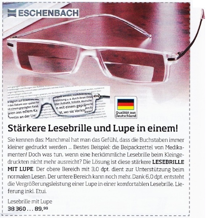Stelle möchte ich auf eine "Lesebrille mit Lupe" aus dem Hause ESCHENBACH