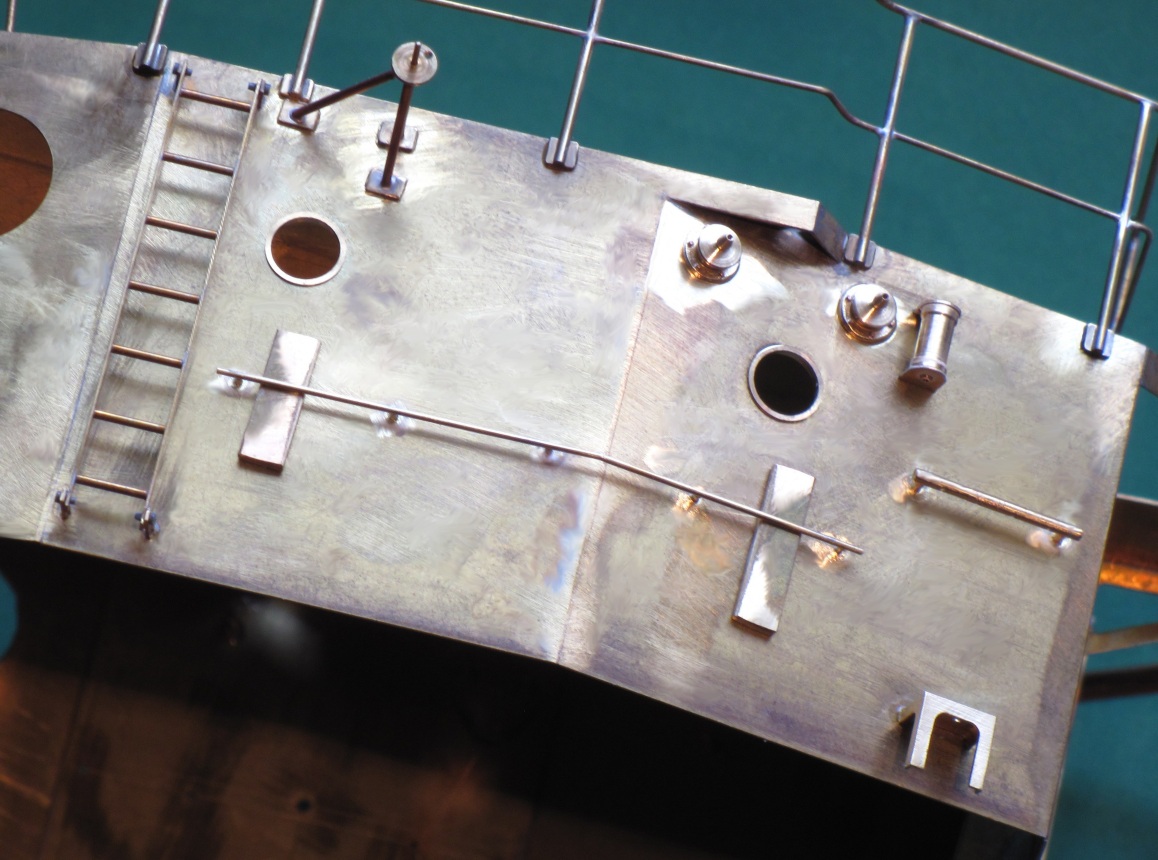 Wer mich kennt, weiß, daß ich bei meinem Modellbau nichts dem Zufall und noch weniger nur dem Geschick überlasse. Es gibt bei jedem Modellbau zahlreiche Fälle, bei denen man kaum etwas mit Vorrichtungen ausrichten kann und wo dann echtes Geschick nötig ist. Deshalb habe ich mir auch hier die kleine Mühe gemacht, um mit zwei einfachen Vorrichtungen diese Handläufe recht schnell und vor allem genau anzufertigen. Die Handläufe mit den kurzen Rohrstücken sollten aus 0,6-mm-Kupferdraht, das wären beim Original realistische 30 mm Rohrdurchmesser, in einer Lötvorrichtung gelötet werden. Anschließend kann man sie in Bohrungen in der Deckshauswand einkleben, welche mit einer Bohrlehre exakt gebohrt wurden.
