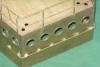 Befassen wir uns zuerst mit der Lötvorrichtung. Sie wird aus einer Platte von Pertinax (entweder Hartgewebe oder Hartpapier, das es in verschiedenen Stärken gibt, oft findet man es als Träger-Wände in Schaltkästen u.ä.) gefräst, weil dieses Material die Hitzebelastung beim Weichlöten gut aushält und weil es kein guter Wärmeleiter ist. Alternativ könnte man die Lötvorrichtung auch aus einer Alu-Platte oder, wenn keine zu großen „Stückzahlen“ zu löten sind, aus Holz machen. Bei Alu für eine Lötvorrichtung geht u.U. zu viel Wärme verloren, weil dieses Material die Hitze schnell weiterleiten kann. Auf keinen Fall kann man eine Lötvorrichtung aus lötfähigem Material machen (z.B. Messing), es sei denn, daß die Stelle, an der gelötet werden soll, großzügig ausgespart wird.