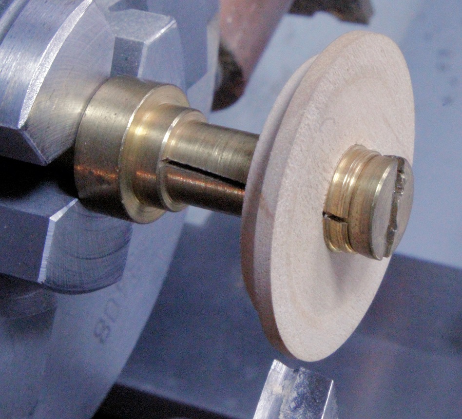 30-mm-Nabe aus Holz gedreht (Mittenbohrung Ø 10) und im Waagerecht-Teilgerät