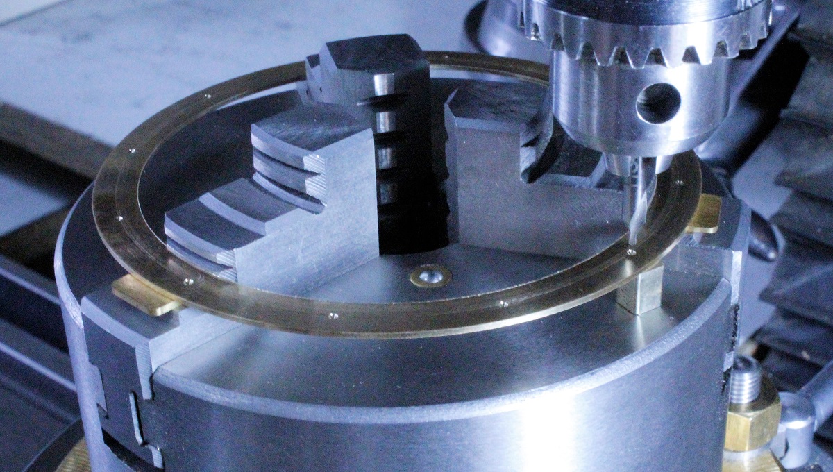 spannt diese drei Teile in ein sehr gut rundlaufendes Vierbacken-Futter. Dabei