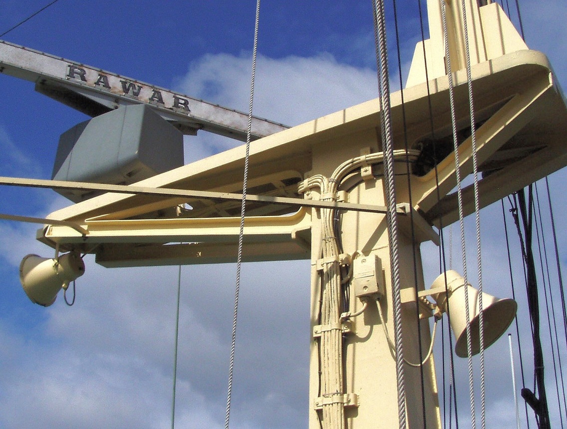 Abb. 21: Ansicht von Steuerbord. Das Vierkantrohr ist der Radar-Hohlleiter, der bis hinauf zum Radargerät führt (vgl. Abb. 14 und 15).