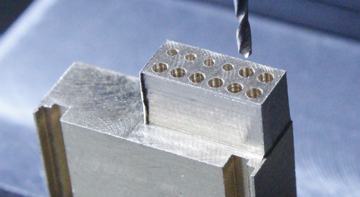Abb. 22: Im Bild werden die 0,85-mm-Bohrungen aufgebohrt. Danach wird er mit einer Metall-Kreissäge auf 2,5 mm Höhe abgesägt.