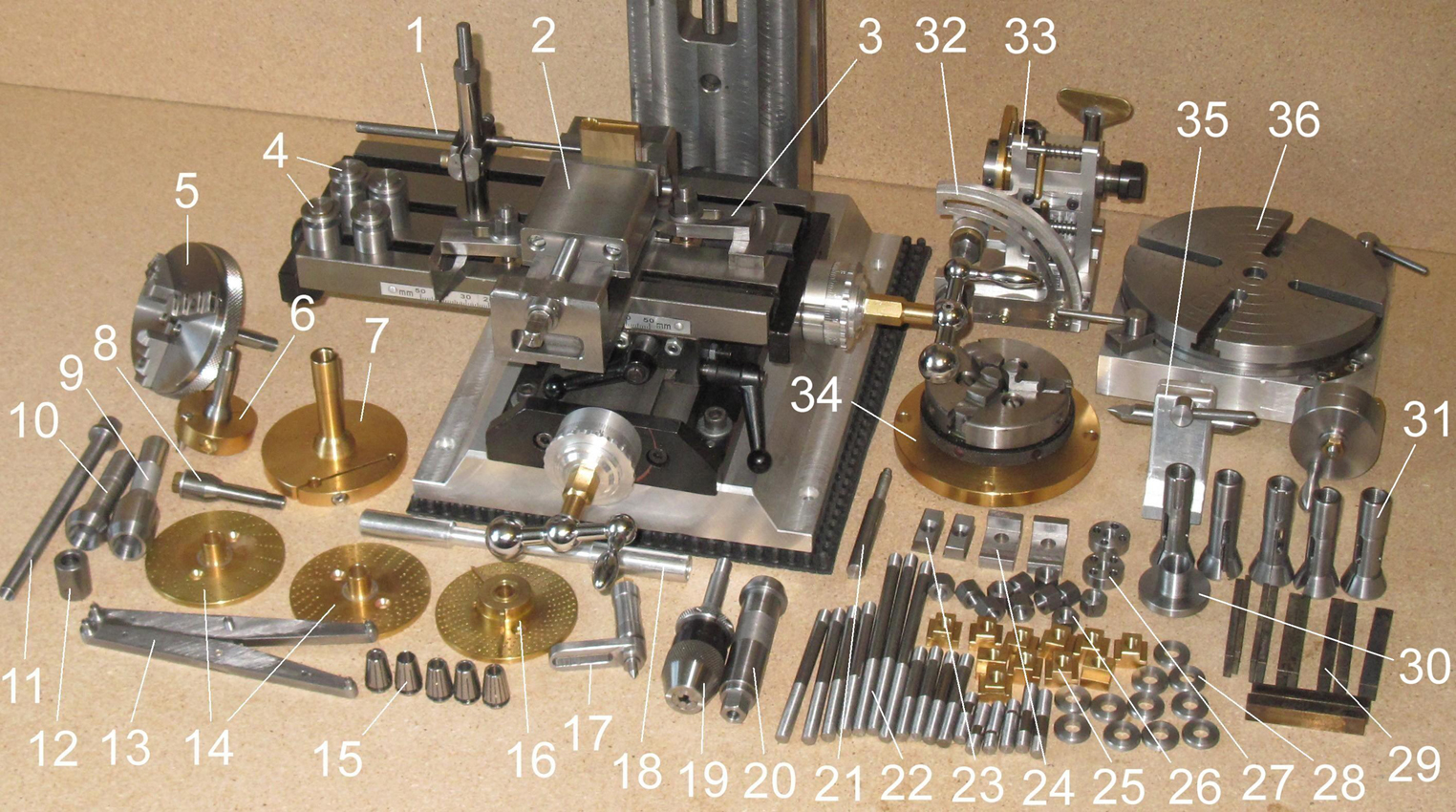 Nummer 32 ist eine Schwenkplatte für den Teilkopf. 6 und 7 sind zwei verschieden