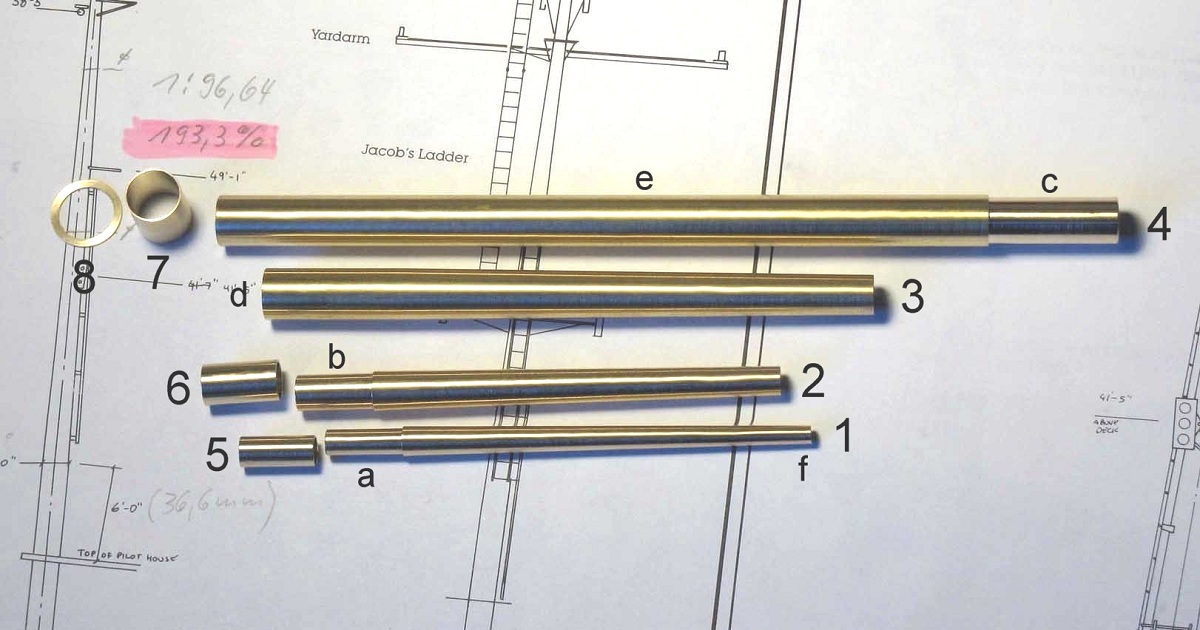 Bei den Teilen für mein 1:50-Vitrinenmodell vom Zerstörer USS CASSIN YOUNG von 1943 spielt das Gewicht eigentlich keine Rolle, weil dieses Modell nie ins Wasser kommt, es würde dort sofort umkippen. Dennoch habe ich dessen Mast, es war zu der Zeit ein sog. Pfahlmast, aus Messing und hohl gedreht. Ich möchte diesen Rohbau ohne die zahlreichen Details daran ausführlich schildern, damit andere Modellbauer diese Herstellungsweise für ähnliche Fälle übernehmen können. Der Mast dieses FLETCHER-Modells besteht im Grunde aus zwei Teilen, ein unteres, vollkommen zylindrisches Teilstück sowie ein oberes konisches Stück. Das untere Stück hat einen Außendurchmesser von 10 mm, das sind 500 mm beim Original, und ist 158 mm lang (7,90 m). Das obere Stück verjüngt sich bis zur Mastspitze auf 3,6 mm und hat dabei eine Länge von 260 mm (13,00 m). Von vornherein stand für mich fest, daß ich das untere Teilstück getrennt als ein Teil herstelle und den konischen Teil aus drei Einzelstücken. Nach der Fertigstellung sollten die Stöße nicht zu erkennen sein.