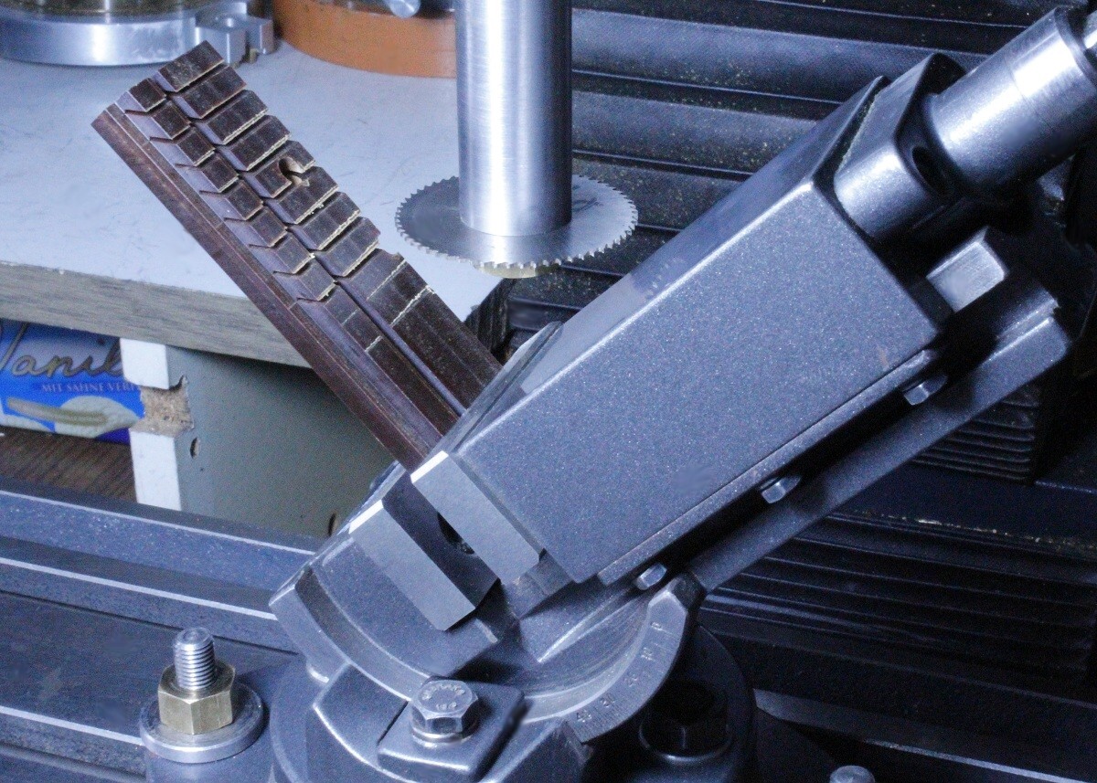 einen 45° schräggestellten Maschinenschraubstock ein. Weil die Platte zu kurz