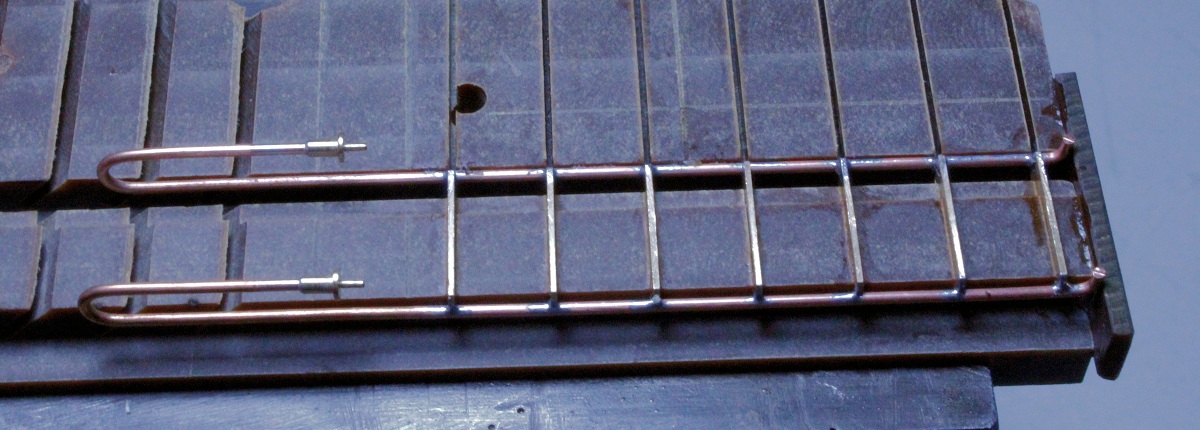 zweite Lötvorgang zu sehen: die Stäbe (d) werden im Mittenabstand von 36,4 mm an