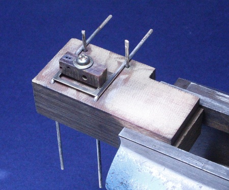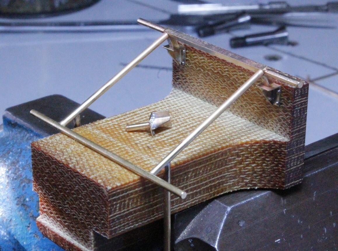 angelötet. Das Teil ist zwischen zwei Pertinax-Winkeln hochkant im Schraubstock