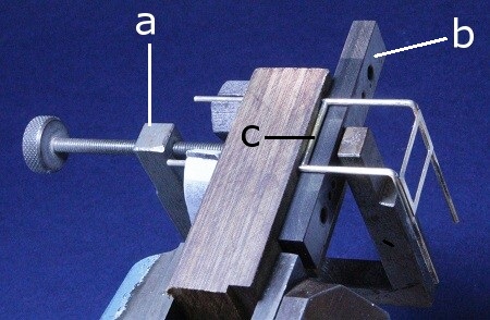 Vorrichtung zusammen mit einem Anschlag (a) an der Werkbank geklemmt. Nur noch