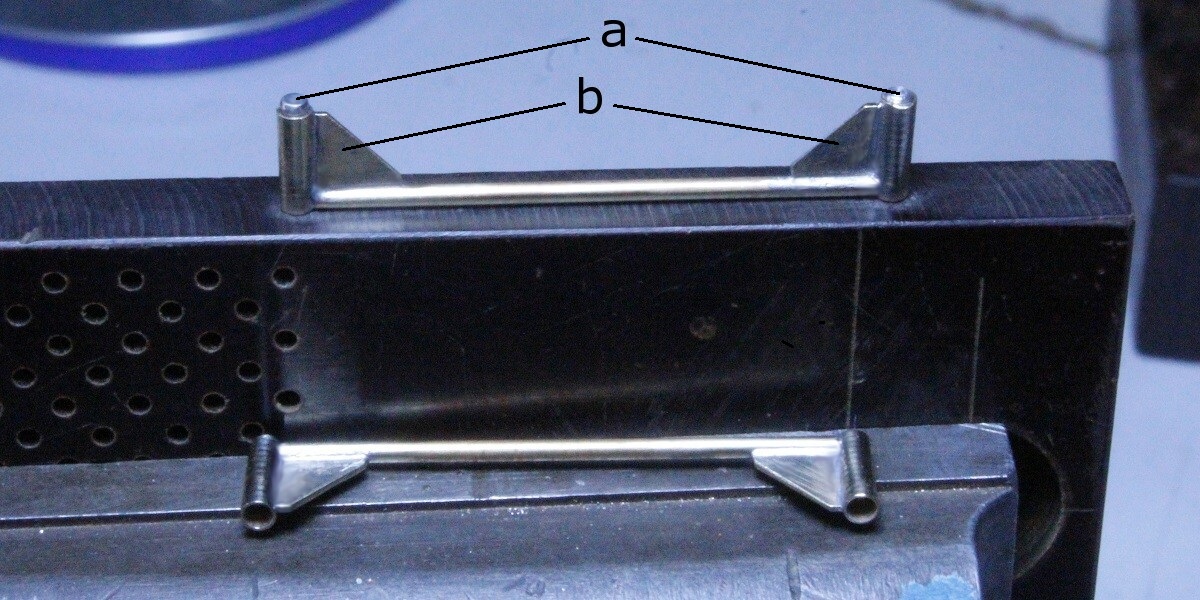 einzulöten. Ein gerades Anschlagstück (b) schiebe ich von unten an die beiden