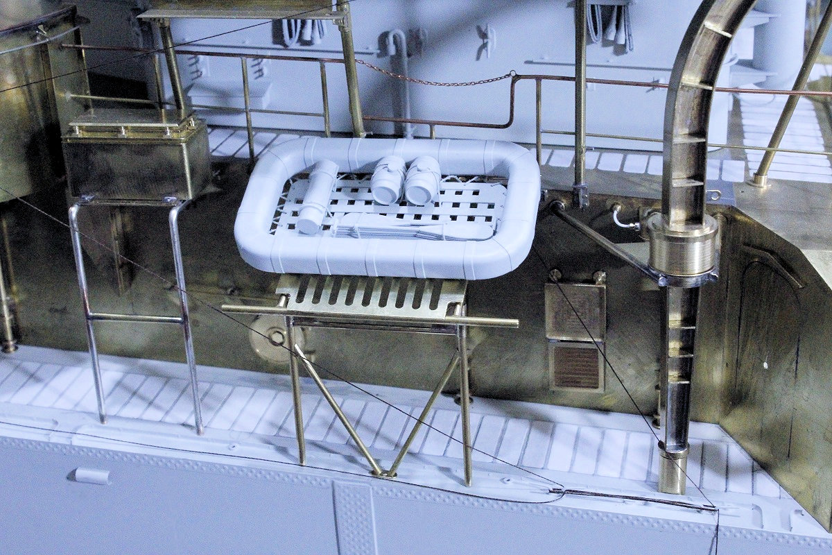Wie jedes größere Schiff hat auch dieser Zerstörer einen Landgang. Über diese schmale (die Stufen sind beim Original nur etwas über einen halben Meter breit) Treppe kann man vom Schiff auf außenbords liegende Beiboote übersteigen. Bei Nichtgebrauch ist dieses Teil an der Innenseite vom Steuerbord-Schanzkleid auf etwa halber Schiffslänge seefest gezurrt. Ein Landgang besteht in der Regel aus drei Teilen: die eigentliche Treppe und eine obere und eine untere Plattform. Dazu gehört noch ein kleiner Davit (Kran), an dem der Landgang hängt und mit dem die Schräglage der Treppe eingestellt wird. An der unteren Plattform ist meist noch ein Puffer angebracht, damit die angelegten Boote nicht beschädigt werden...