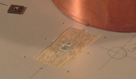Sperrholzdeck weggefräst. Der Kleber wird an sechs Punkten als winzige "Berge"
