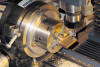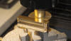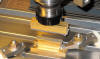 (Auch Messing kann man in diesen Dimensionen nicht in einem Schnitt absägen. Man sägt Span für Span immer etwas tiefer, auch Gleich- und Gegenlauffräsen sollte man dabei beachten. Meine Regime für das Absägen der 7 mm breiten Streifen will ich an der Stelle einmal schildern: Der erste Span im Gegenlauffräsen ist vom „Ankratzen“ nur 0,3 mm tief, damit die Säge ersteinmal eine "Spur" findet. Bei der „Rückfahrt“ im Gleichlauffräsen schon weitere 0,5 mm tiefer. Dann wieder Gegenlauffräsen 0,8 tiefer und zurück dann 1 mm tiefer. Die Säge steht nach diesen vier Schnitten nun schon 2,6 mm tief. Sie hat dabei im Sägespalt so viel Führung, daß man nun bei den folgenden Spänen 1,5 mm Tiefe oder beim Zurückfahren 1 mm Tiefe zustellen kann, mehr nicht. Und Messing kann trocken gesägt werden. Die Drehzahl darf relativ hoch sein, damit die feinen Späne weggeschleudert werden. Und wichtig: Die Frässpindel muss exakt senkrecht zur Zugrichtung des Supports stehen. Vgl. dazu hier die Abb. 7)