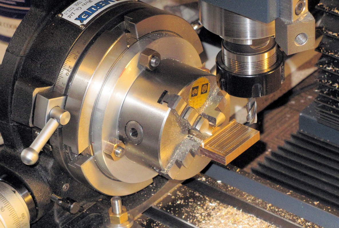 auf dem Tisch der Fräsmaschine gespannt; darüber mit einem Spannzapfen die