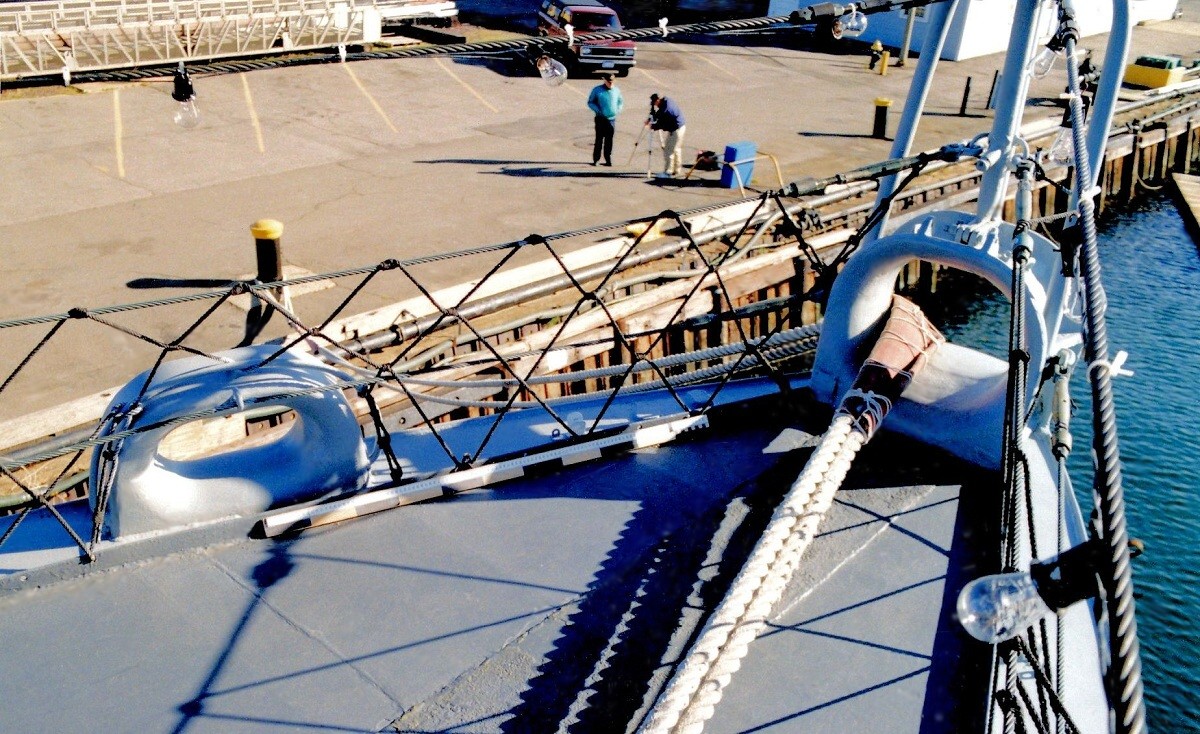 aufgesetzten Bug-Flaggstock und links eine Seitenklüse vom US-amerikanischen