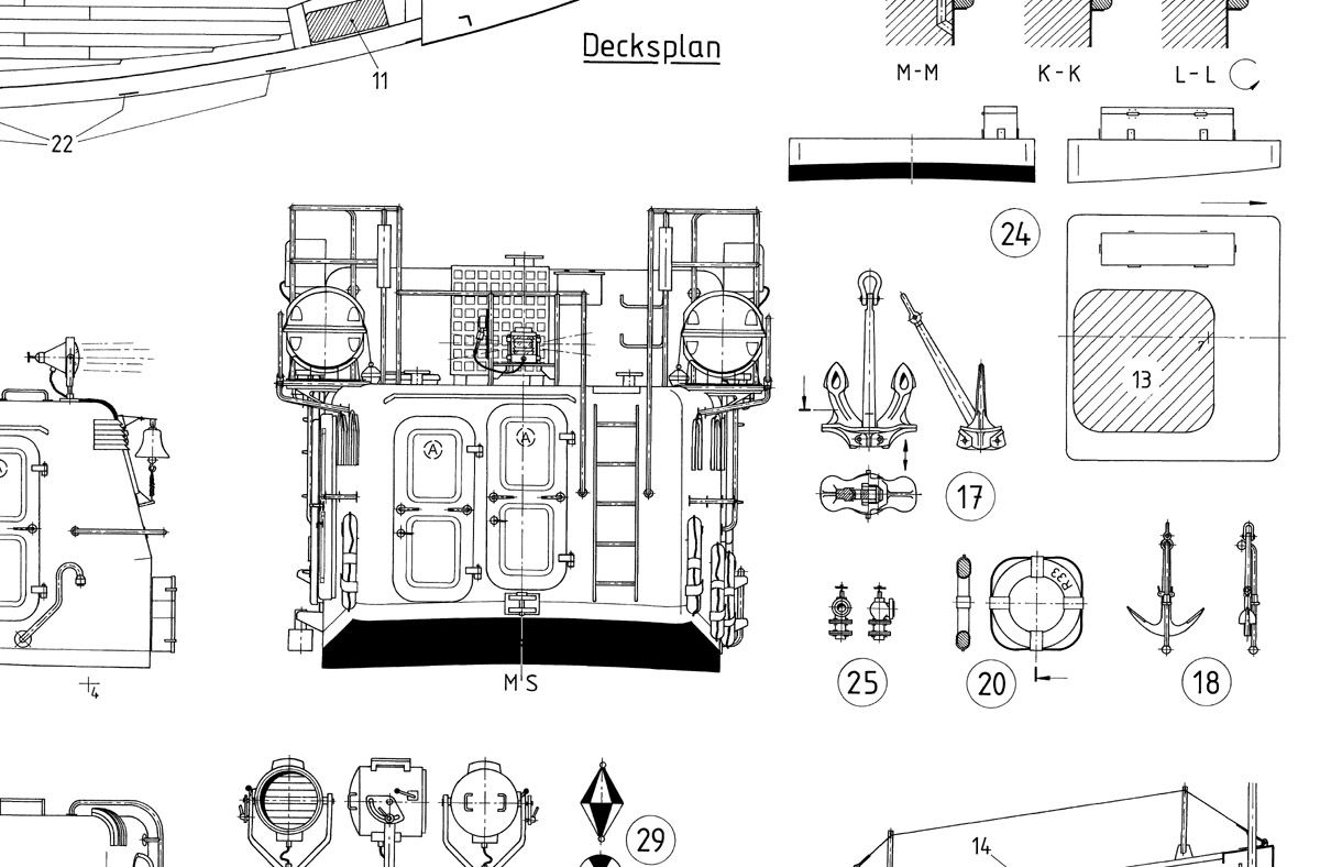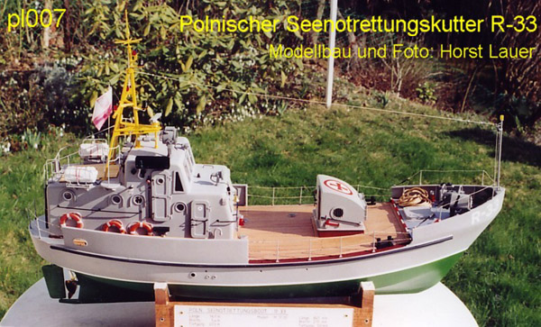 Seenotrettungsboot der polnischen Marine. Der Plan entstand auf der Grundlage eines sehr einfachen polnischen Modellplanes und nach Fotoauswertung, selbst gestrakte Rumpflinien. Spantenrisse sind für andere Modellgrößen auch im M 1:25 und 1:50 im Plansatz enthalten. Maße des Modellrumpfes: 676 x 216 x 81 (Tiefgang) mm, Modellgewicht: 3,61 kg, 1 Propeller, Holzdeck, Fischkutter-Knickspant-Rumpf, 4 Planbögen.