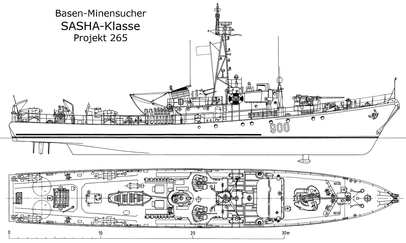In den letzten Jahren erhalte ich oftmals auch aus dem Ausland unverhoffte Hilfe von Hobbyfreunden, die mich bei meiner Arbeit zumeist uneigennützig unterstützen wollen. Als Grund dafür sehe ich meine zahlreich besuchte Homepage im Internet. So bekam ich vor einiger Zeit einen intensiven Kontakt zu einem jungen Mann, Gennady K. aus Russland, der meine besondere Vorliebe für die kleineren Kampfschiffe kannte. Er selbst hatte zu Zeiten der Sowjetunion auf einem Minensucher der SASHA-Klasse gedient und schickte mir nun als Anhängsel zahlreicher E-Mails eine ganze Serie, konkret 141 Stück, von mehr oder weniger retuschierbedürftiger Schwarz-weiß-Scans aus seinem Fotoalbum. Die große Fotoserie machte mir zweierlei klar: erstens, daß man es bei der Sowjetmarine mit dem Fotografier-Verbot, das im Grunde bei allen Marinen der Welt besteht, doch nicht zu ernst nahm aber auch den katastrophalen Pflegezustand der Boote. Aus Buchveröffentlichungen und einer älteren Ausgabe der sowjetischen Modellbauzeitschrift „Modelist Konstruktor“ entnahm ich Skizzen bzw. „Modellplanversuche“ und konnte nun daraus meine Skizze von der SASHA-Klasse, welche im Mittelpunkt dieses Schiffsporträts steht, entwickeln. Ich habe die Zeichnung im Maßstab 1:100 ausgeführt. Sie konnte hier nur verkleinert abgebildet werden. Ich möchte an dieser Stelle gern einmal an meinen besonderen Service erinnern (bzw. ihn erwähnen), der darin besteht, daß ich alle (!) meine Zeichnungen und Pläne digitalisiert habe und sie bei Interesse (Tel.: 0721-47040072) in nahezu jedem Maßstab ausdrucken lassen kann. Selbstverständlich kann ich auch die oben erwähnte Fotoserie bei Bedarf auf eine CD brennen, denn Gennady K. hat, hilfsbereit wie er ist, seinerzeit ausdrücklich keinen Copyright-Anspruch gestellt.