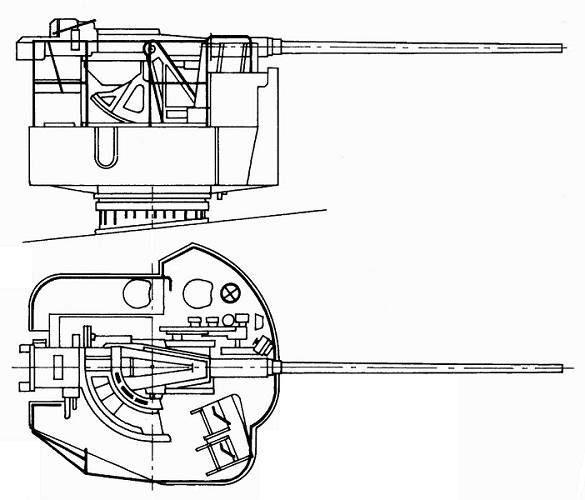 und Zwillingslafetten-Aufstellung. Ihre Rohre waren 46 Kaliber lang. Das reichte